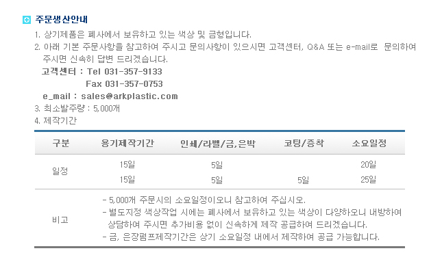 °í°´¼¾ÅÍ customer center 031-357-9133 FAX 031-357-0753 Email sales@arkpack.co.kr Á¦Ç°¹ß¼Û ¸¶°¨½Ã°£ ÆòÀÏ 16½Ã,Åä¿äÀÏ 12½Ã ÀÌÀü ÀÔ±ÝÈ®ÀÎ µÈ Á¦Ç°¿¡ ÇÑÇØ ´çÀÏ ¹ß¼Û ¾÷¹«½Ã°£ ÆòÀÏ 09:00 - 18:00 Åä¿äÀÏ 09:00 - 13:00 Á¡½É½Ã°£ 12:30 - 13:30